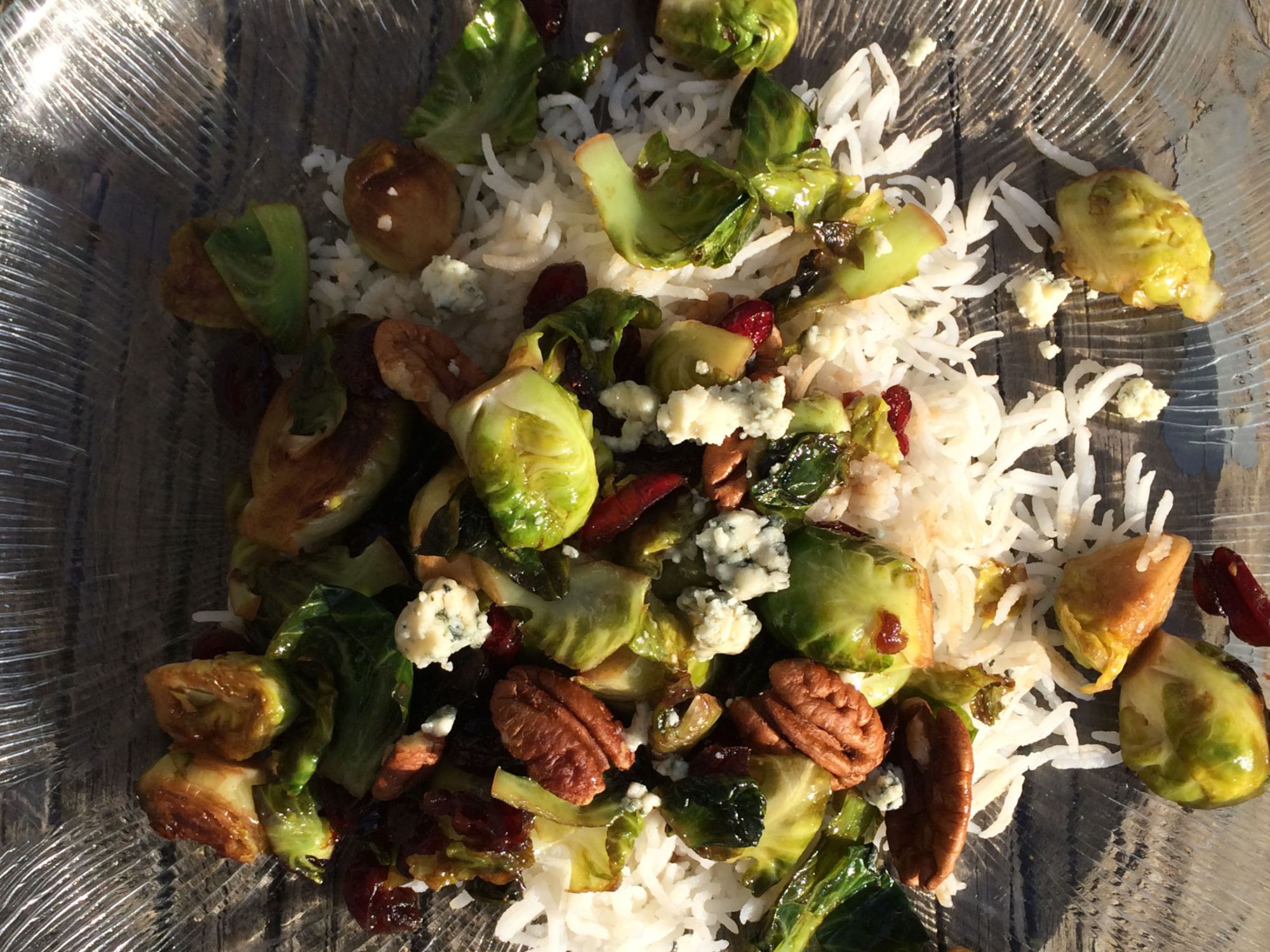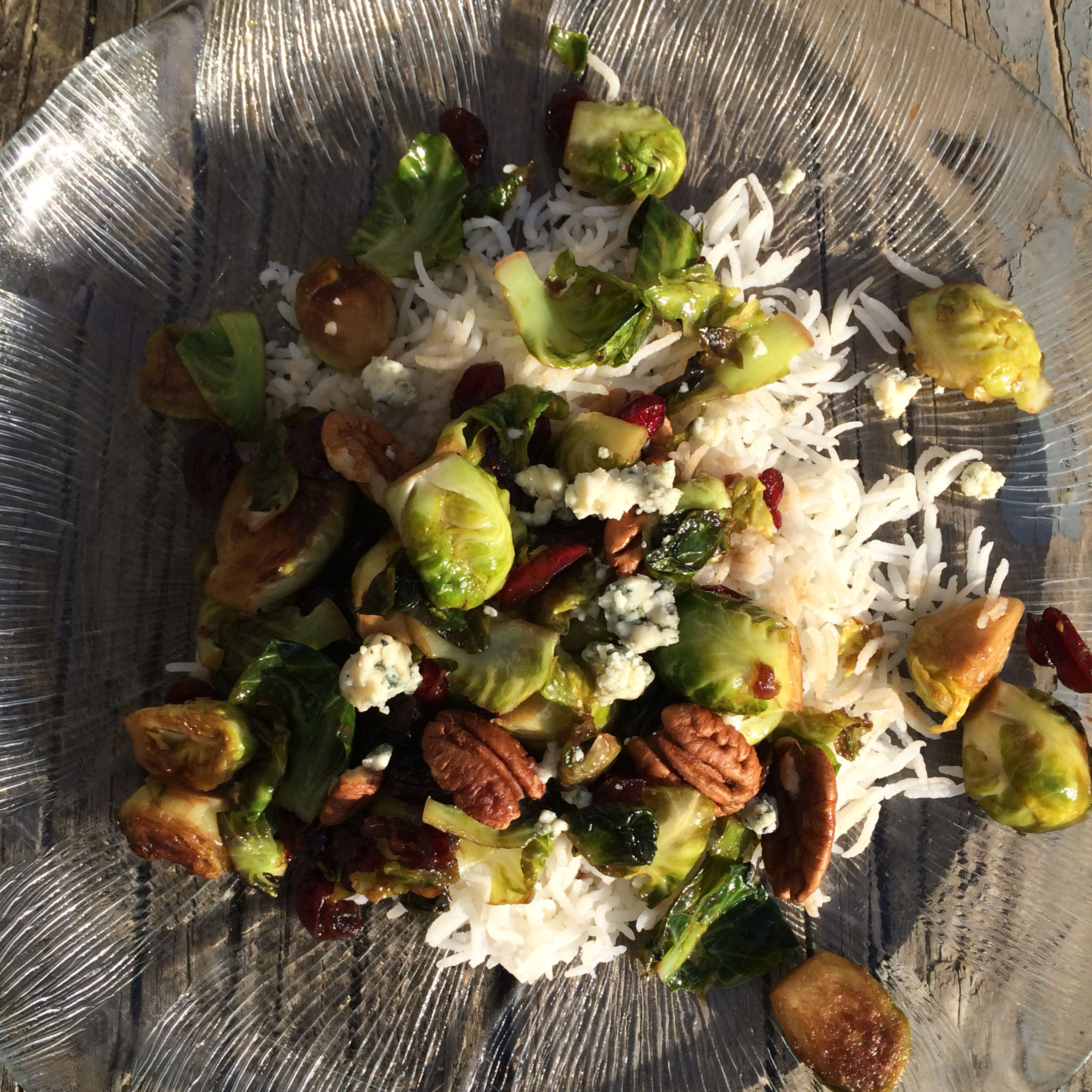 Coat bottom of large skillet with a little extra olive oil. Place skillet on burner over medium high heat and add sprouts. Sear sprouts, then turn heat down to medium and add cranberries. Cook for 8-10 minutes, until sprouts are tender but not mushy.